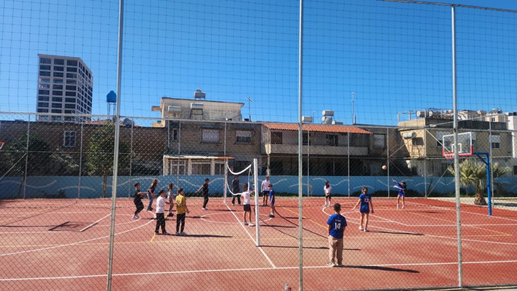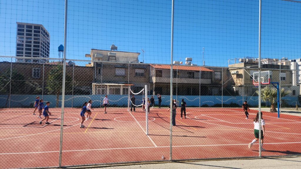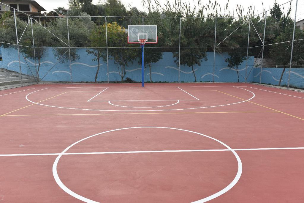 Një rrethim me material izolues blu me valë deti i jep godinës së shkollës prej guri aromë rinie, freski deti; fusha e ndërtuar me parametra shkencorë e mbuluar me një material rrethues rrjete, koshat e rinj që presin topat në rrjetat e tyre, tapeti gomë që mezi pret të ndiejë në trupin e tij këmbët e lojtarëve të vegjël.